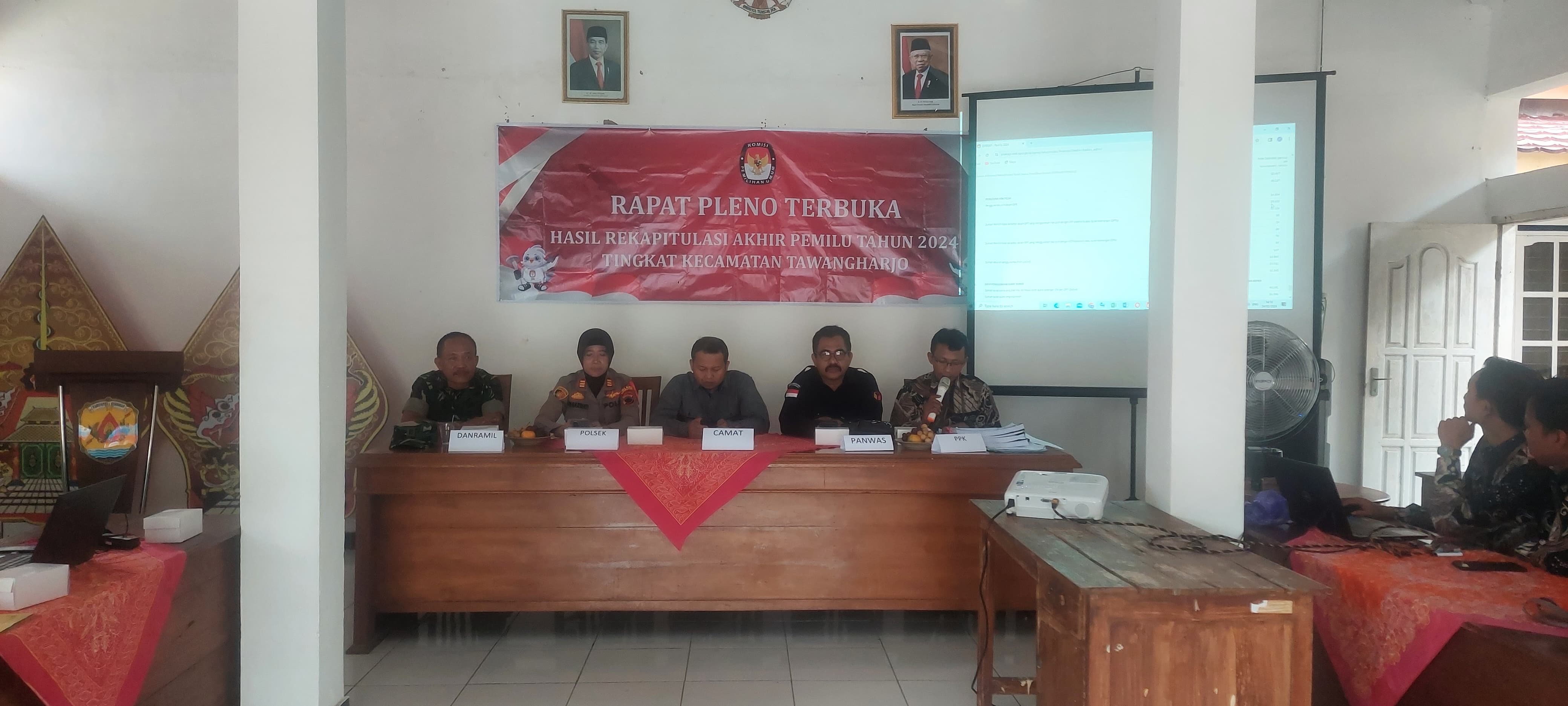 Sabtu 24 Februari 2024. Pelaksanaan kegiatan Rapat Pleno Terbuka Hasil Rekapitulasi Akhir Pemilu Tahun 2024 Tingkat Kecamatan Tawangharjo di Pendopo Kecamatan Tawangharjo