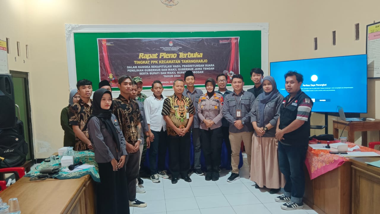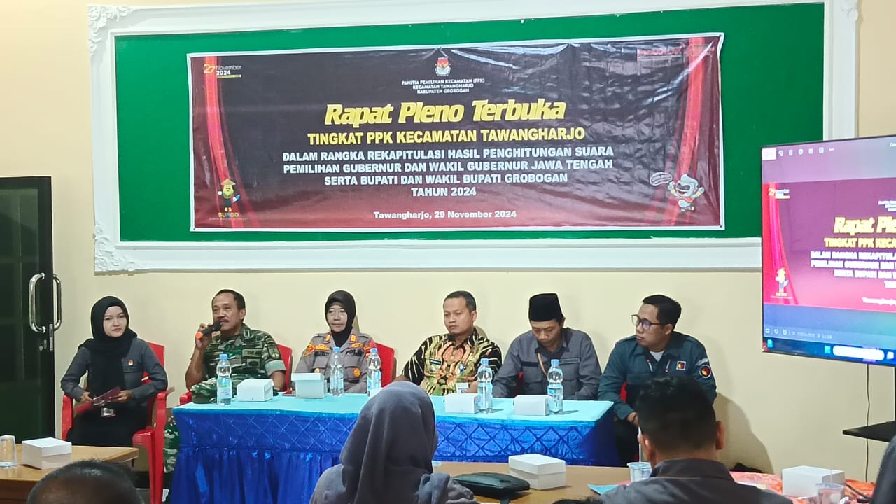 Jum'at, 29 November 2024. Rapat Pleno Terbuka Tingkat PPK Kecamatan Tawangharjo dalam rangka Rekapitulasi Hasil Penghitungan suara Pemilihan Serentak Tahun 2024 di Aula Kantor Kecamatan Tawangharjo