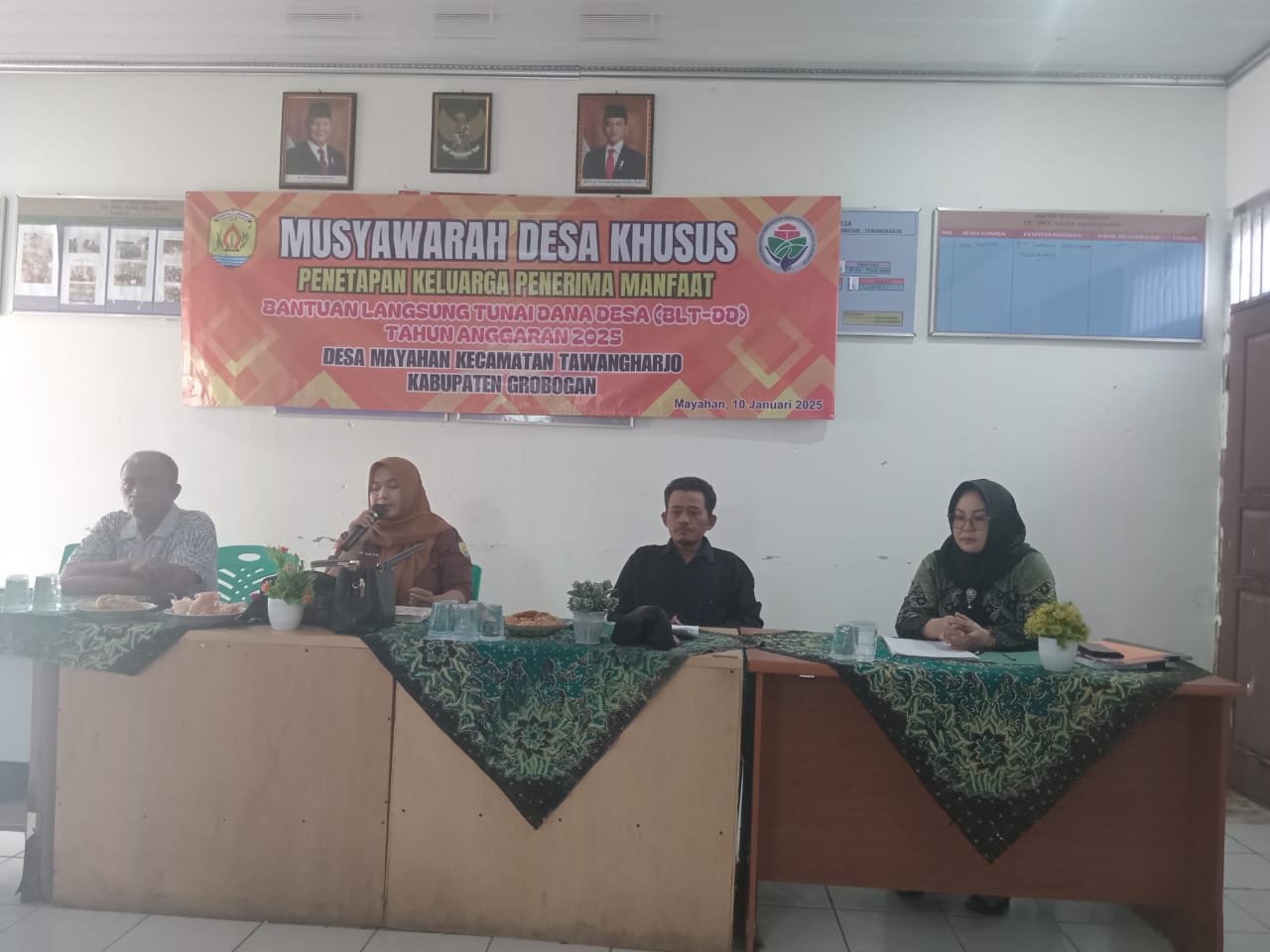 Jum'at, 10 Januari 2025. Musyawarah Desa Khusus Penetapan Keluarga Penerima Manfaat Bantuan Langsung Tunai Dana Desa (BLT-DD) TA. 2025 Desa Mayahan di Kantor Balai Desa Mayahan