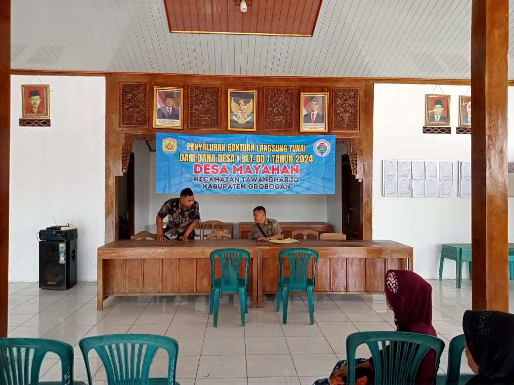 Kamis, 5 Desember 2024. Pemantauan pelaksanaan kegiatan penyaluran BLT DD Bulan Desember 2024 oleh Petugas BPR BKK Purwodadi (Perseroda) cabang Tawangharjo di Pendopo Kantor Balai Desa Mayahan