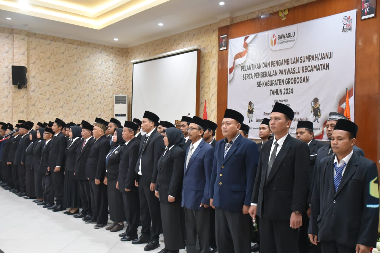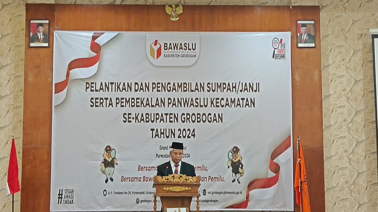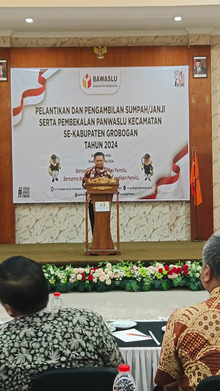 Jum'at, 24 Mei 2024. Pelaksanaan Pelantikan dan Pengambilan Sumpah / Janji serta Pembekalan PANWASLU Kecamatan se-Kabupaten Grobogan Tahun 2024 yang dihadiri oleh Kasi Trantibum Kecamatan Tawangharjo di Ruang Ballroom Hotel Grand Master Purwodadi