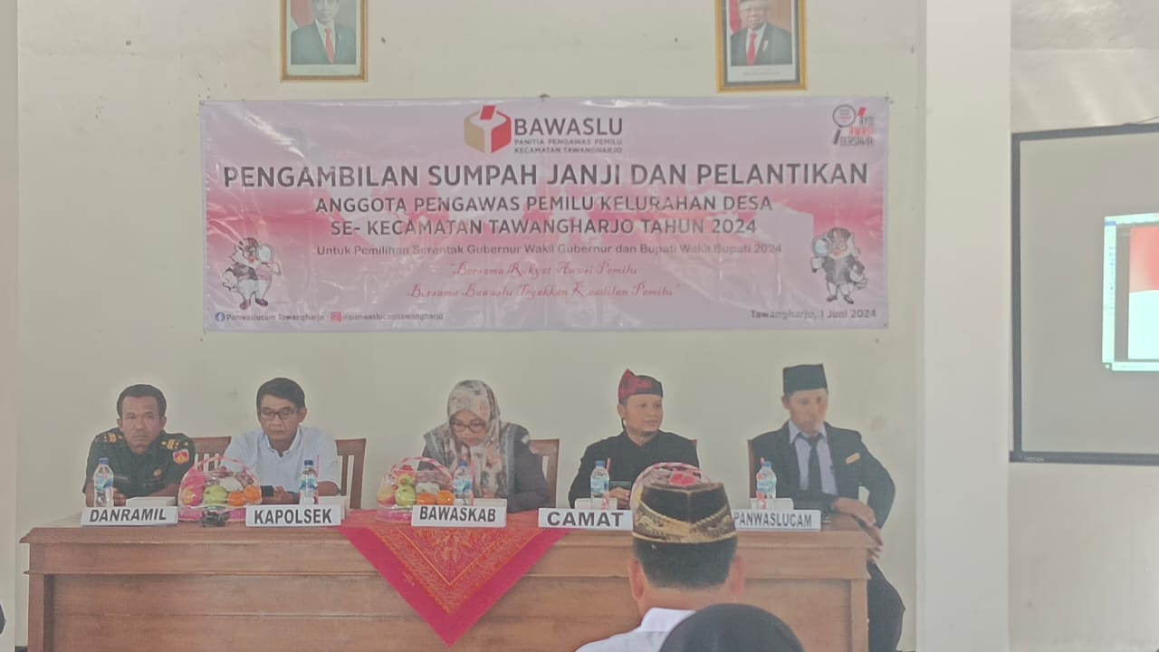 Sabtu, 1 Juni 2024. Pelaksanaan Pengambilan Sumpah Janji dan Pelantikan Anggota Pengawas Pemilu Kelurahan Desa se-Kecamatan Tawangharjo Tahun 2024 di Pendopo Kantor Kecamatan Tawangharjo