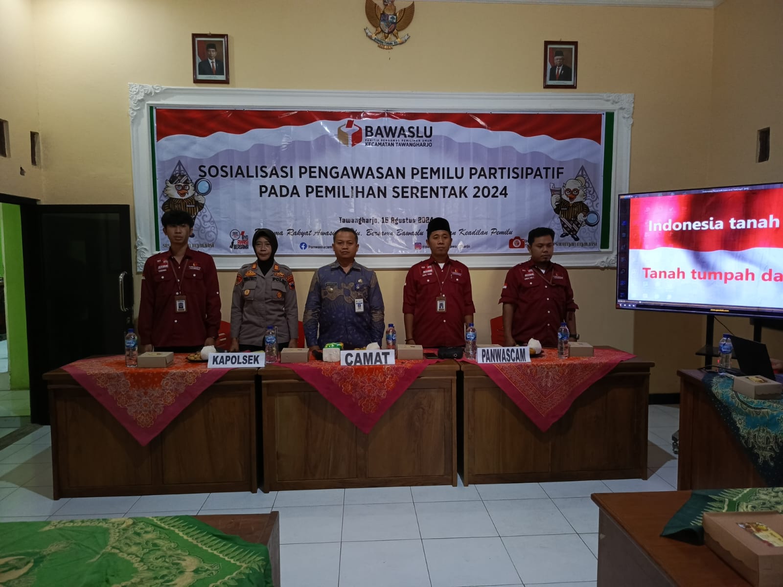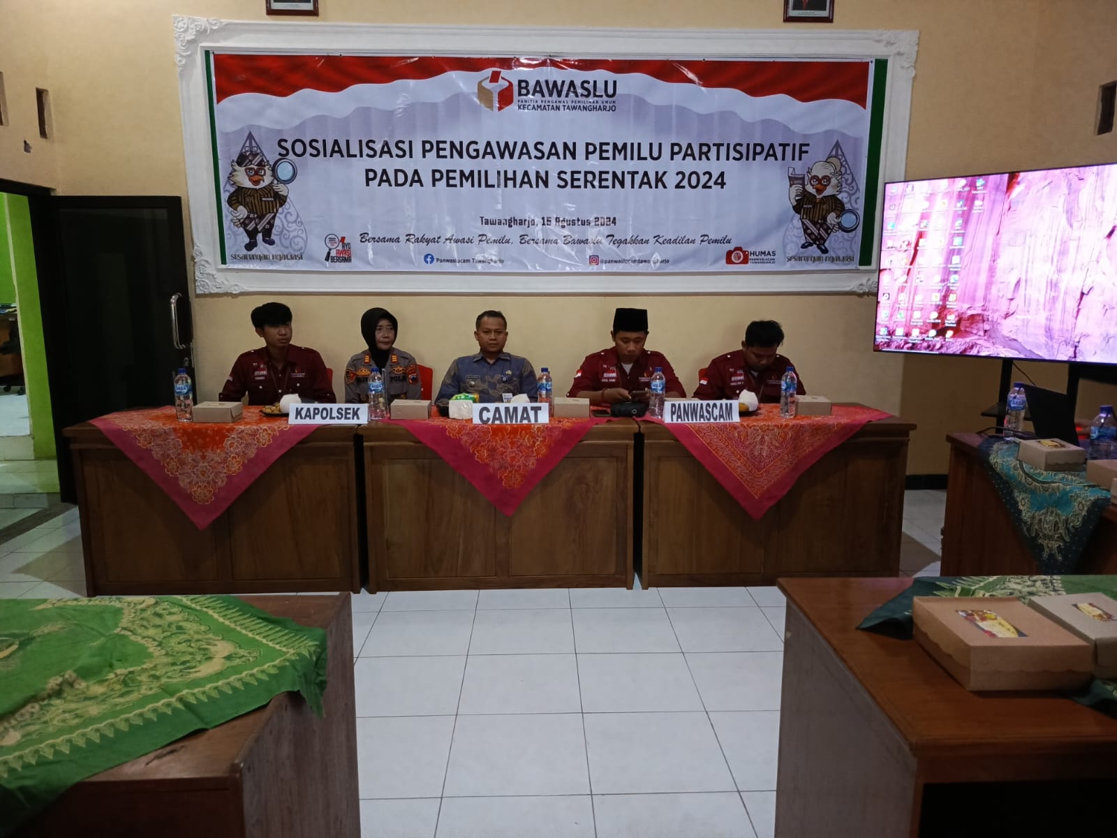 Kamis, 15 Agustus 2024. Sosialisasi Pengawasan Pemilu Partisipatif pada pemilihan serentak 2024 di Aula PKK Kantor Kecamatan Tawangharjo Details Category: Uncategorised Published: Monday, 19 August 2024 22:12 Written by admin tawangharjo Hits: 236 Prev Next