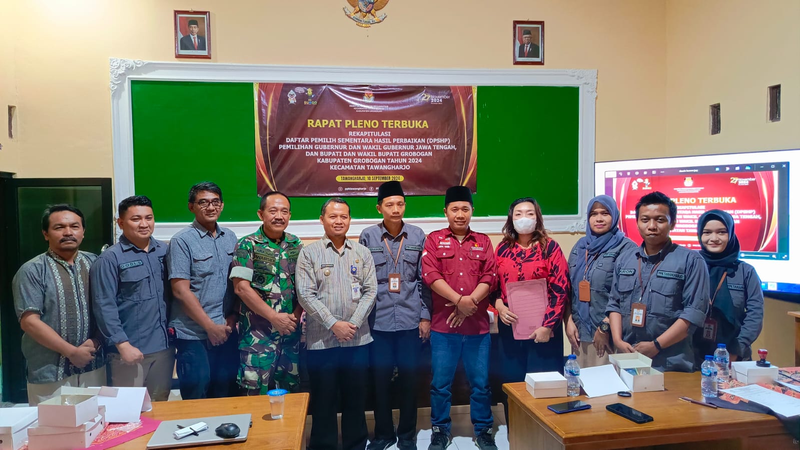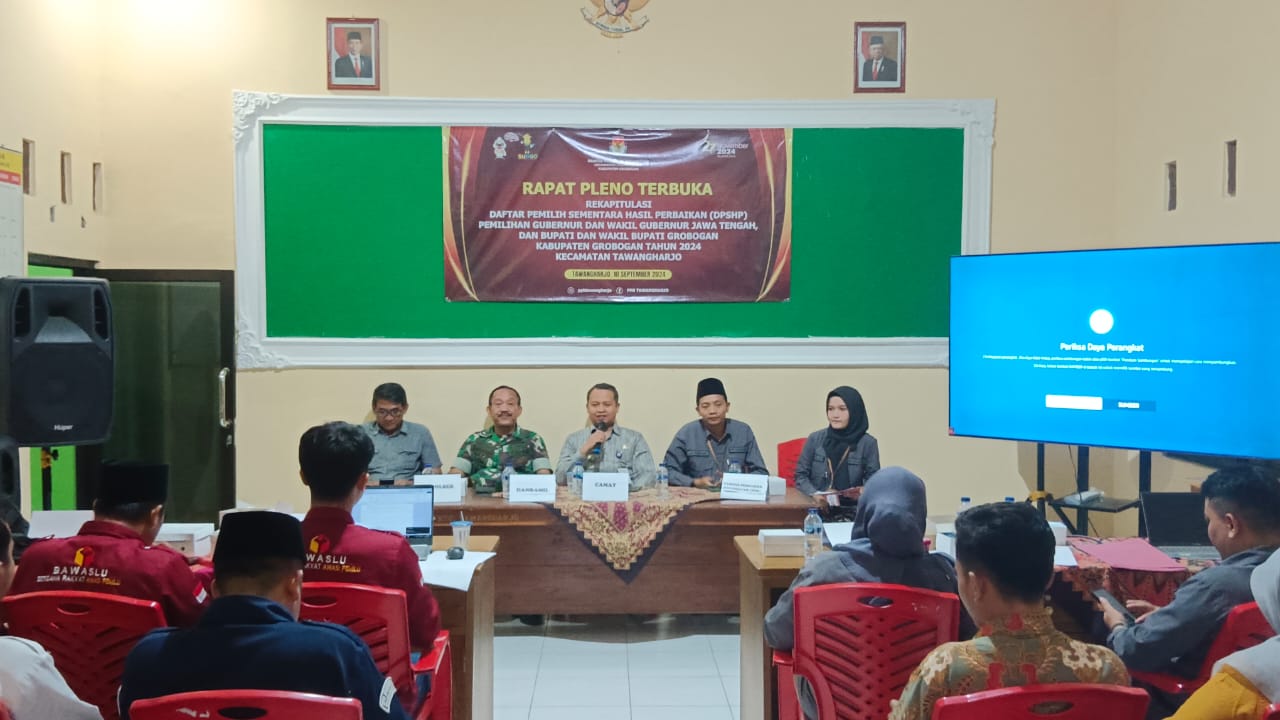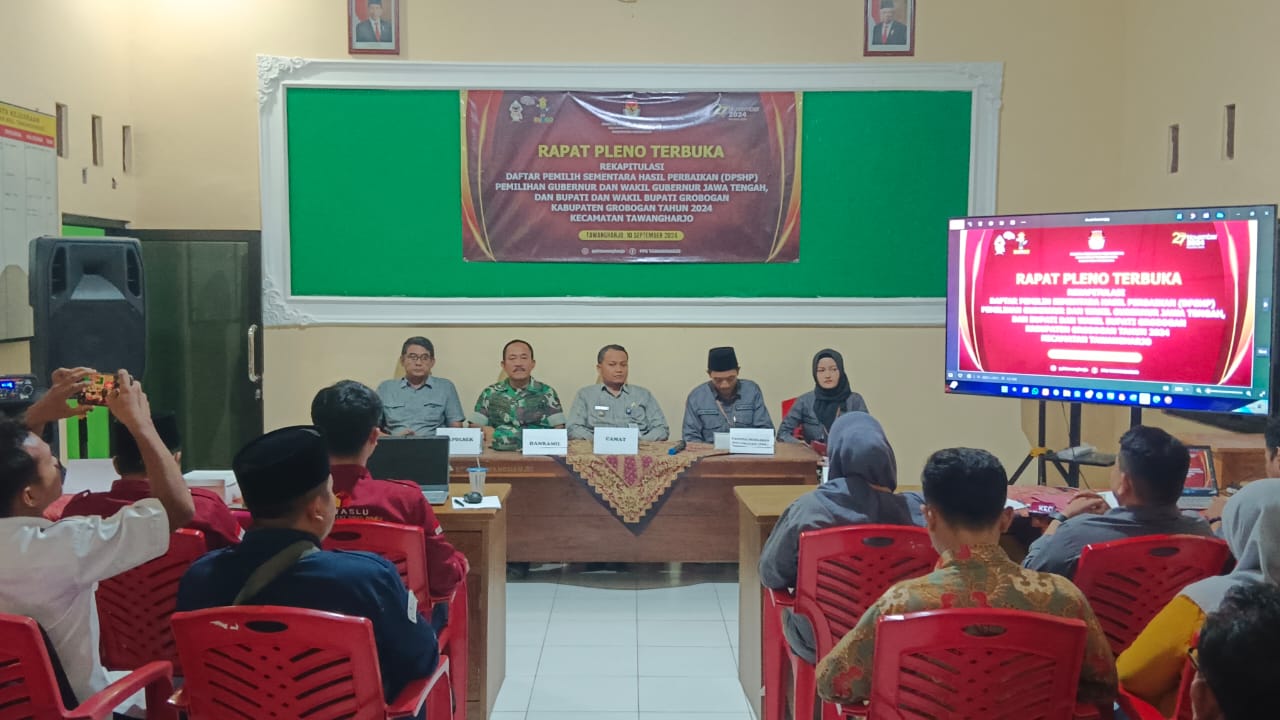Selasa, 10 September 2024. Rapat Pleno Rekapitulasi Daftar Pemilih Sementara Hasil Perbaikan (DPSHP) dalam pemilihan Gubernur dan Wakil Gubernur Jawa Tengah serta pemilihan Bupati dan Wakil Bupati Grobogan Tahun 2024 di Aula Kantor Kec. Tawangharjo