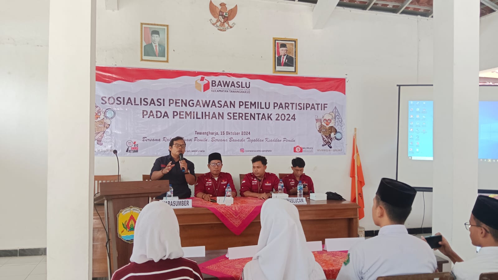 Selasa, 15 Oktober 2024. Sosialisasi Pengawasan Pemilu Partisipatif pada pemilihan serentak Tahun 2024 di Pendopo Kantor Kecamatan Tawangharjo Details Category: Uncategorised Published: Tuesday, 22 October 2024 21:36 Written by admin tawangharjo Hits: 246 Prev Next
