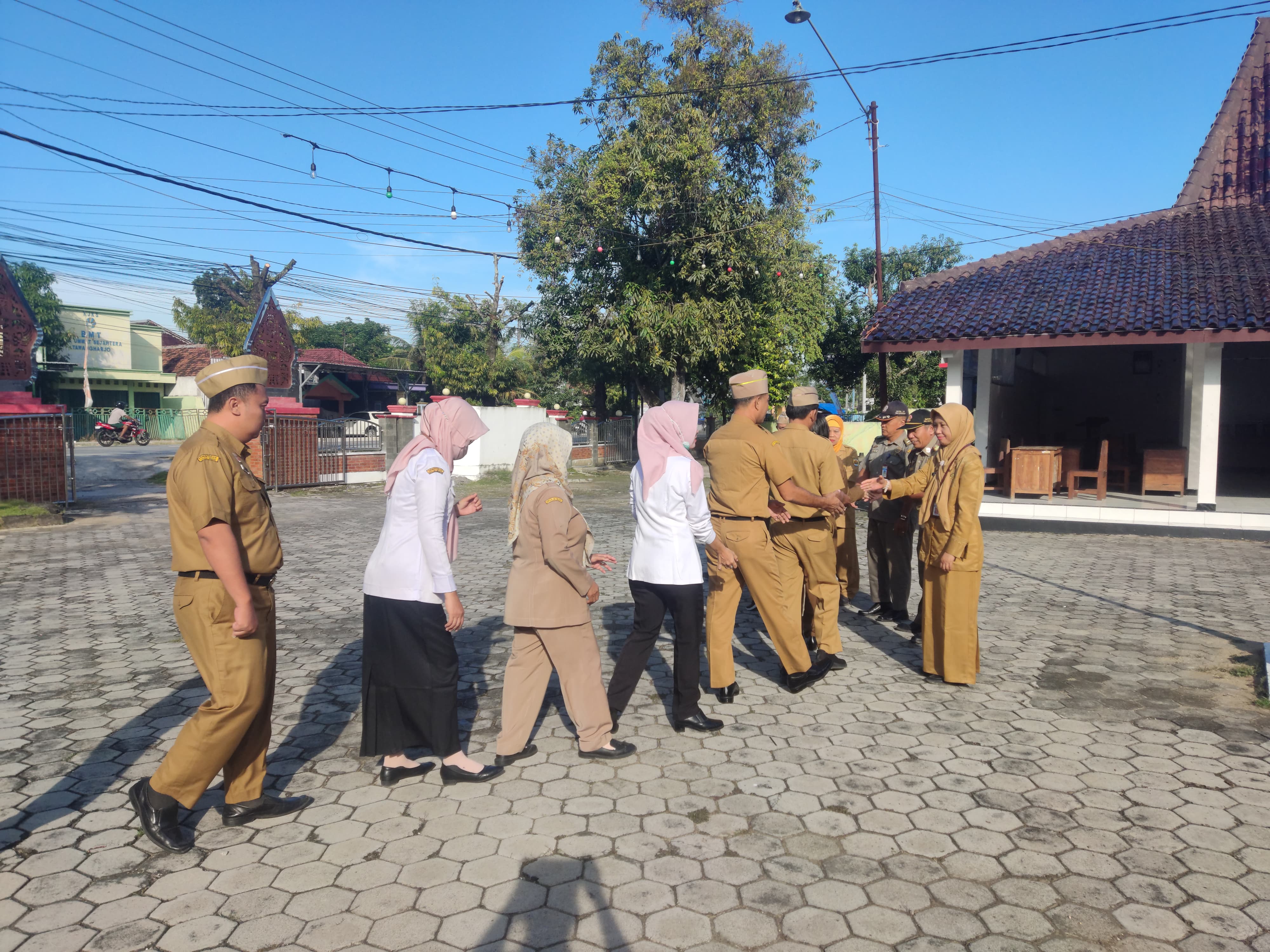 Senin, 28 April 2025. Apel pagi Karyawan-Karyawati Sekretariat dan Dinas Instansi Lingkungan Kantor Kecamatan Tawangharjo yang dipimpin oleh Ibu Sekcam Sri Sugiwati, S.P., M.M. di Halaman Kantor Kecamatan Tawangharjo