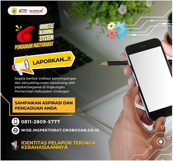 Segala bentuk penyimpangan dan penyalahgunaan wewenang oleh pejabat/pegawai di lingkungan Pemerintah Kabupaten Grobogan kini dapat Anda adukan melalui sistem Whistle Blowing System (WBS) dan SP4N-Lapor.