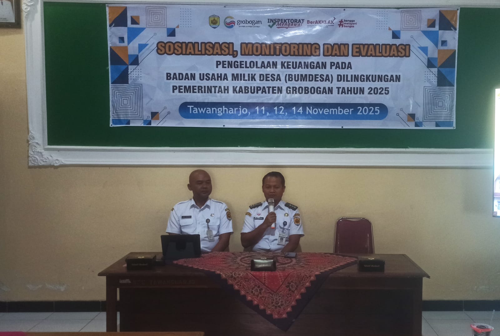 Rabu, 12 November 2025. Sosialisasi, Monitoring dan Evaluasi Pengelolaan Keuangan pada Badan Usaha Milik Desa (BUMDESA) di Lingkungan Pemerintah Kabupaten Grobogan Tahun 2025 di Aula Kantor Kecamatan Tawangharjo
