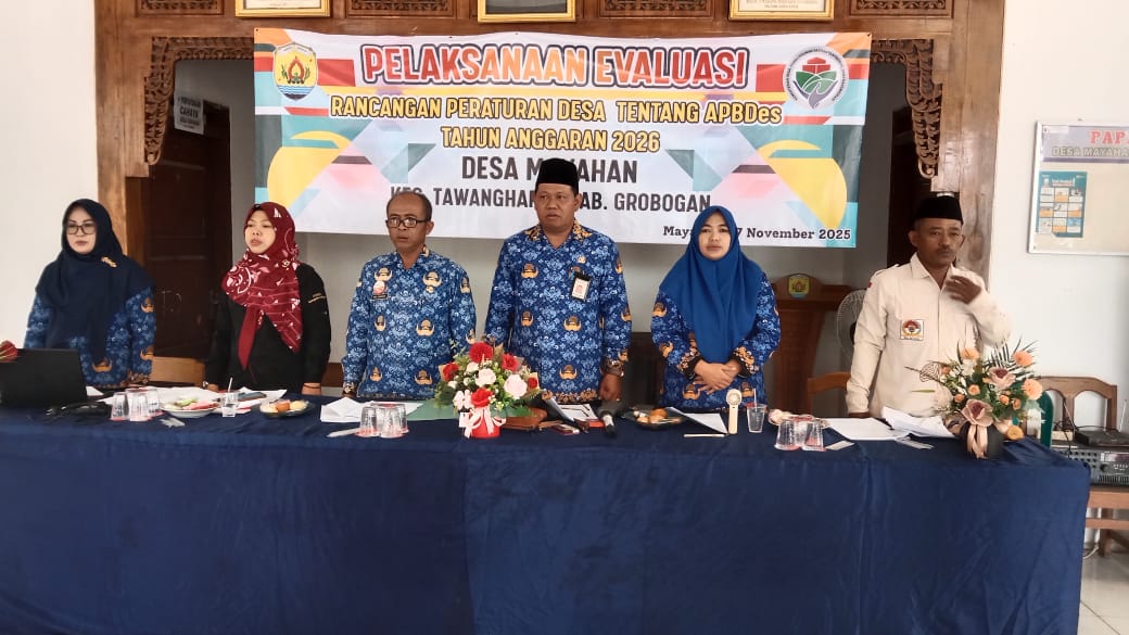 Senin, 17 November 2025. Pelaksanaan Evaluasi Rancangan Peraturan Desa Tentang APBDes Tahun Anggaran 2026 Desa Mayahan di Pendopo Balai Desa Mayahan Details Category: Uncategorised Published: Tuesday, 02 December 2025 18:20 Written by admin tawangharjo Hits: 56 Prev Next